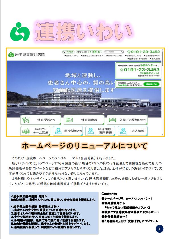 広報誌「連携いわい」は、連携医療機関等との連携関係を深めることを目的として、当院の様々な情報を発信しております。