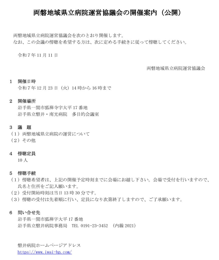 2025/11/12お知らせ 両磐地域県立病院運営協議会を令和7年12月23日(火)14時に開催いたします。会議の傍聴を希望される方は下記要領により傍聴することができます。 詳しくは下記をご覧ください。